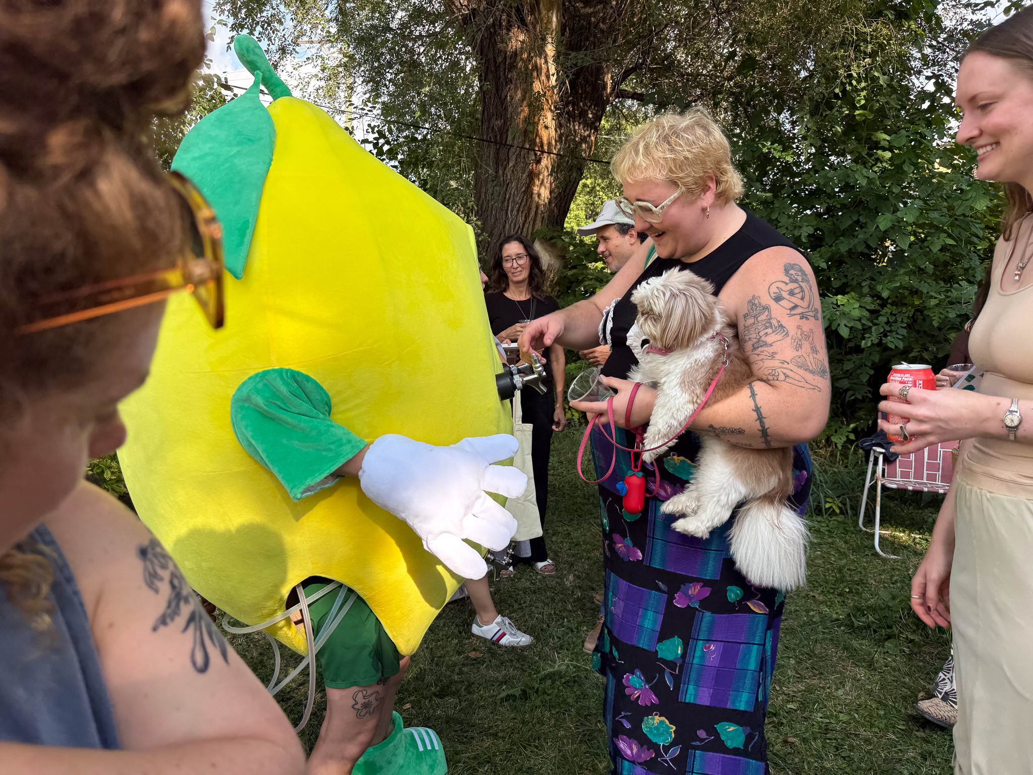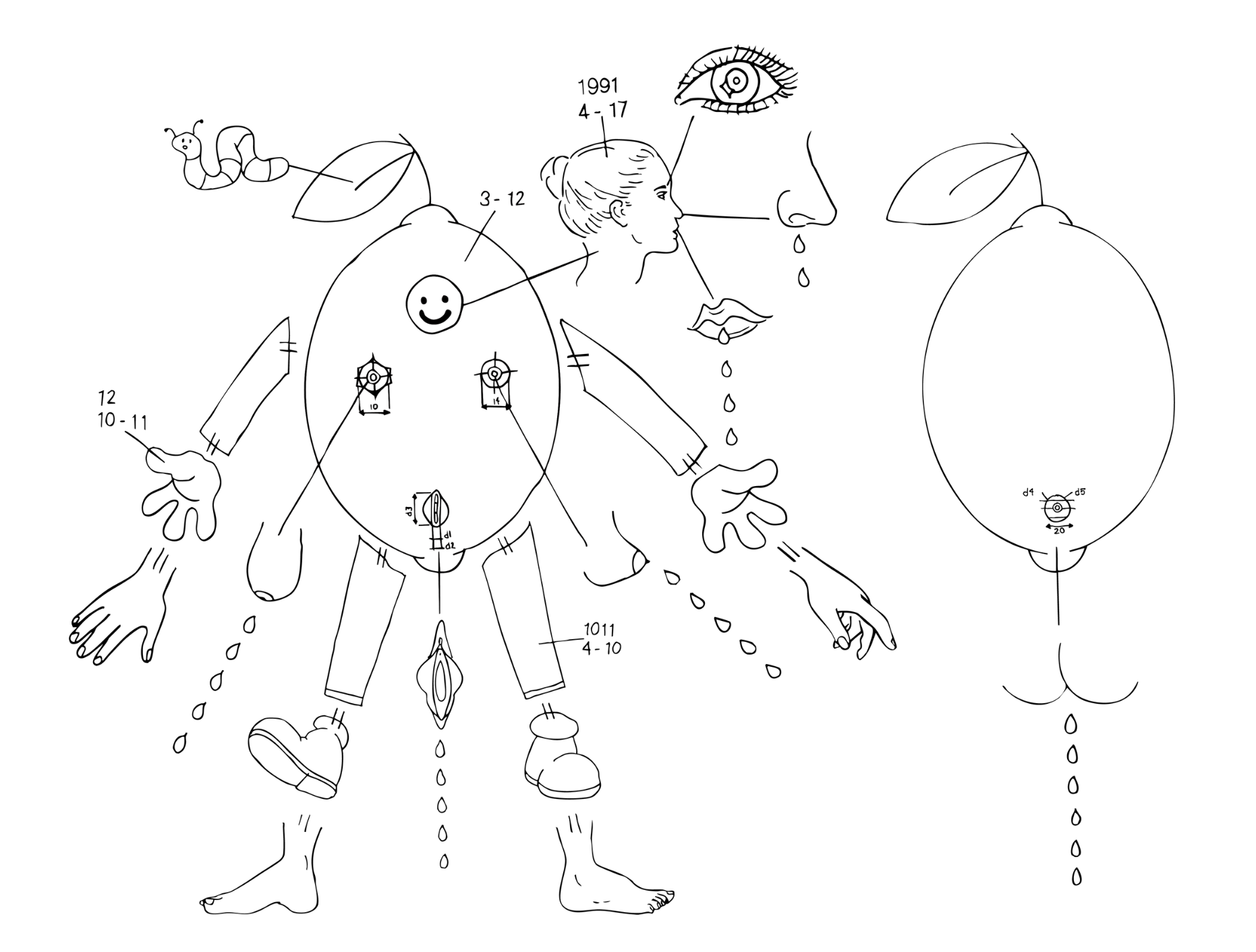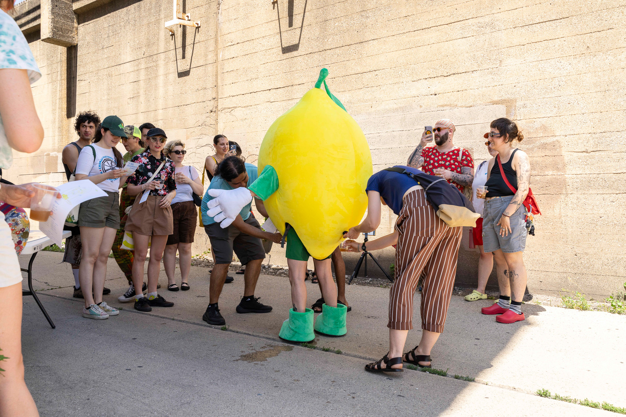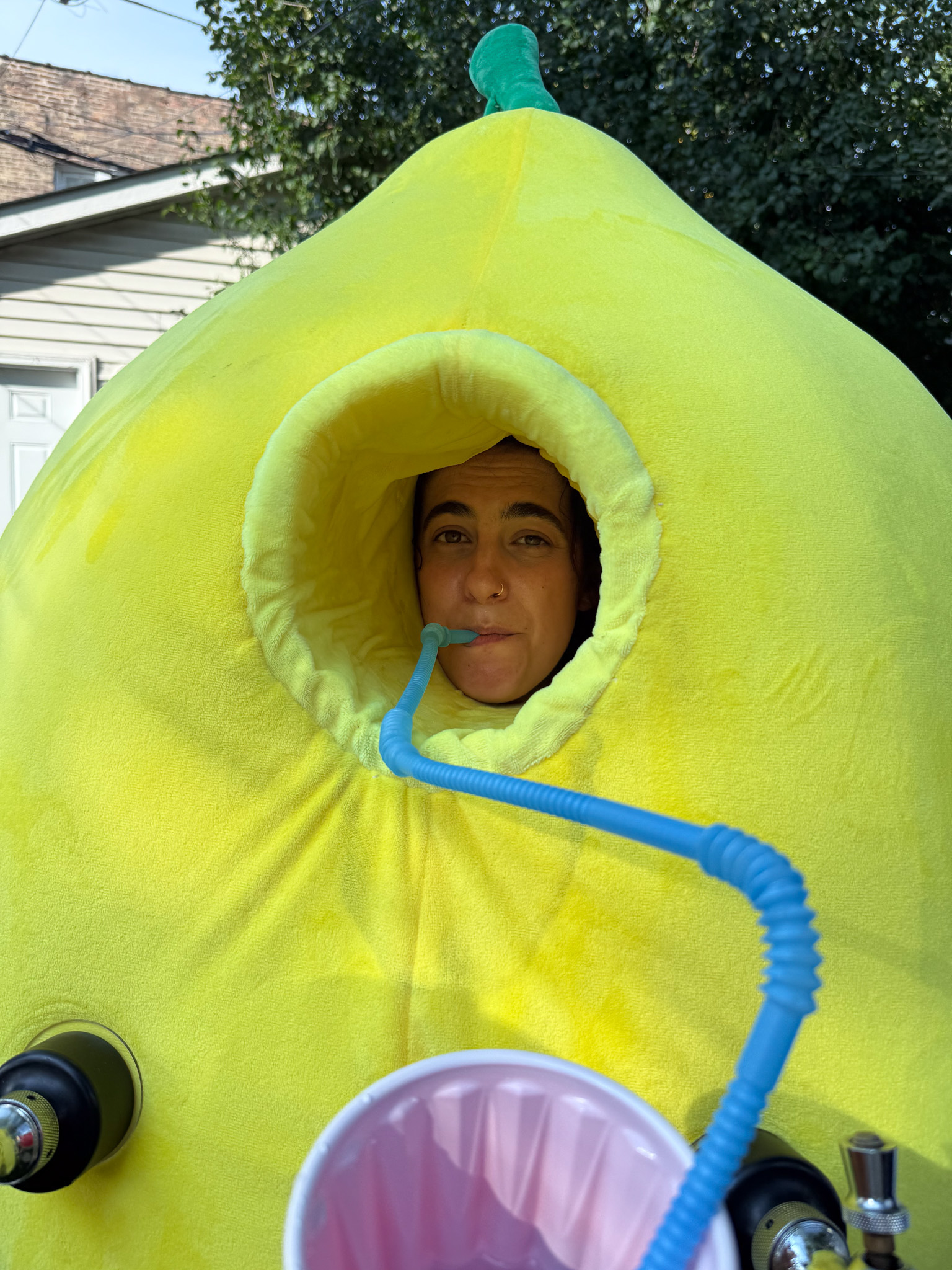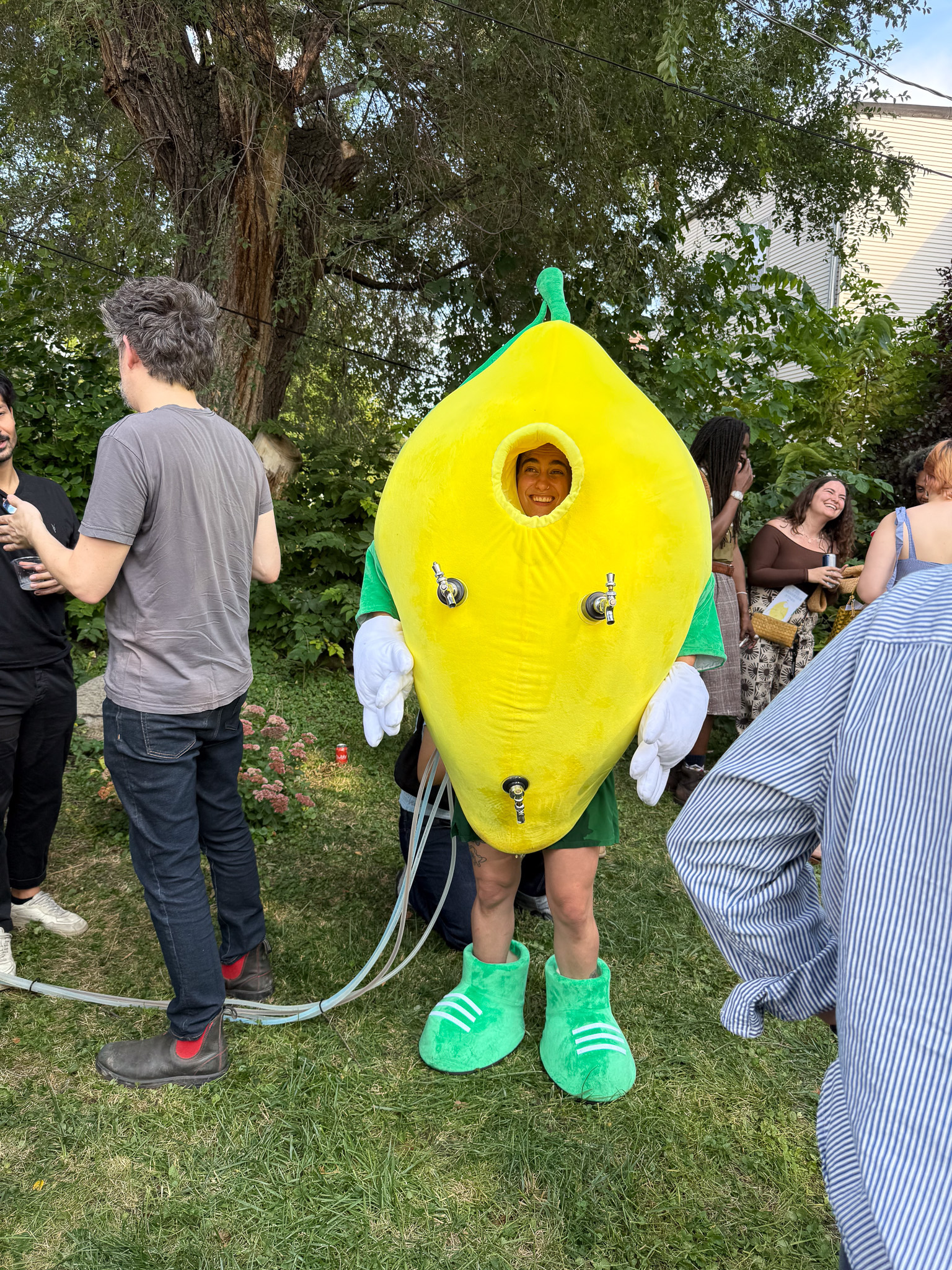 An interactive endurance performance, with songs and dances, that uses play and absurdity to engage with embodiment, nourishment, sexuality, and the commodification of my own aging female body as I dress up in a lemon costume with spouts symbolically located where breasts, a uterus, and an anus would be.